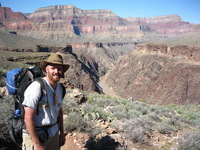 | Large -- Medium Me (Jason Barnes) in front of an excellent view of the Colorado River in the midst of its Vishnu Schist Gorge. A shot from this point that Jani took in 2003 was bought from her for $250! | |